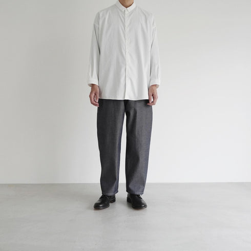 Because it uses polyester, it would be ideal to have it processed in the Hokuriku region, which is known for its polyester, to ensure stable physical properties, but to give it a denim-like texture, we have it processed at a factory that specializes in denim. Because of this, the shrinkage in the vertical direction is likely to vary, so when washing, please wash with water and dry in the sun.