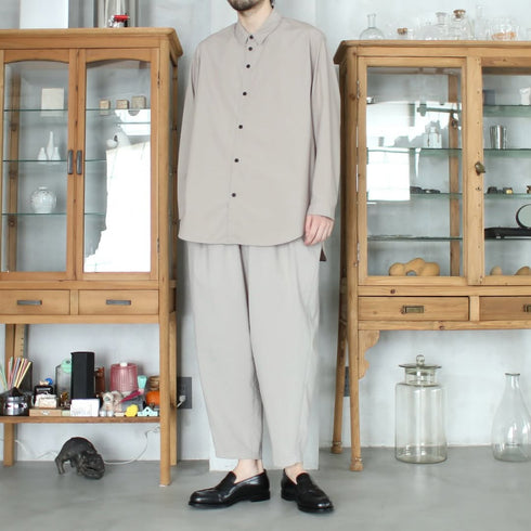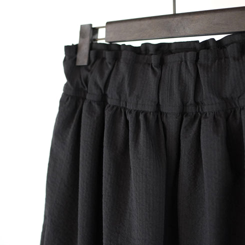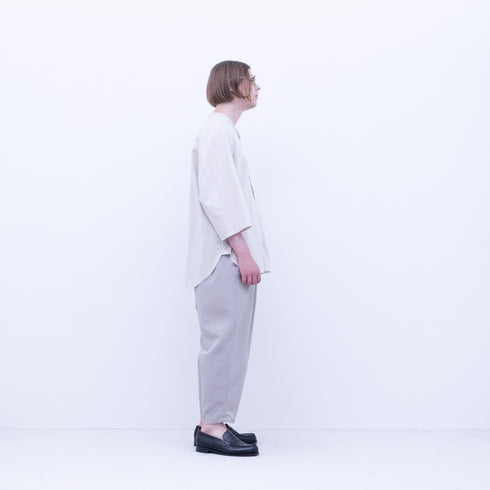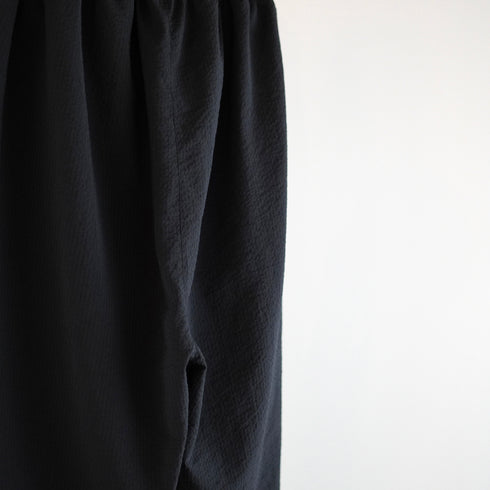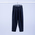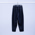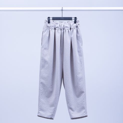 Gathered tapered pants, front and back side seam pockets, elastic waistband and drawstring