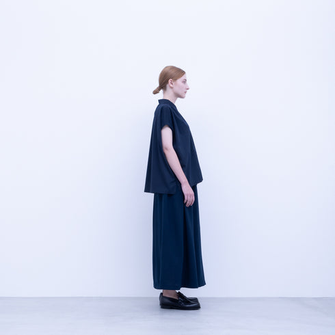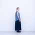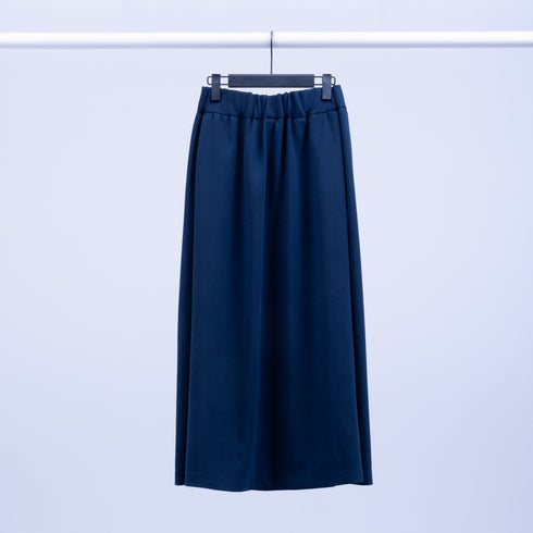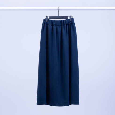 A-line skirt, large tucks at sides, pockets at back seams, elastic waistband and drawstring