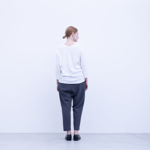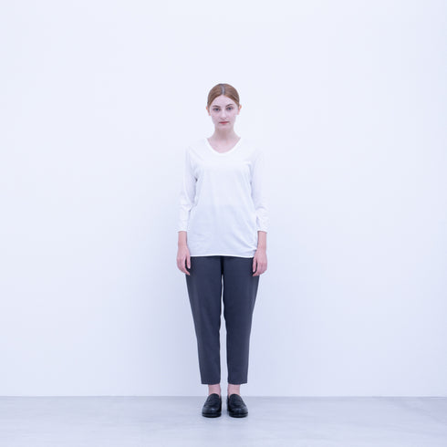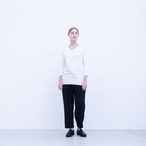 This is a slightly thin, high-density cotton jersey made from extra-long 120-ply South Indian cotton. The clothes themselves are made to run diagonally to create distortion and create a loose atmosphere.