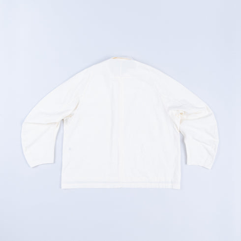 Shirt collar with stand collar Big sleeve shirt Split raglan and pivot sleeve combined Curved sleeve No cuffs Just right shoulders Oversized Long back hem Side slits Large darts on back sleeves