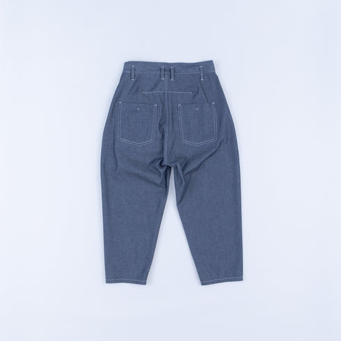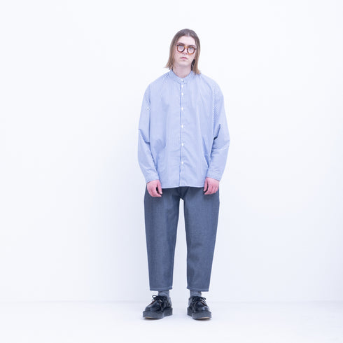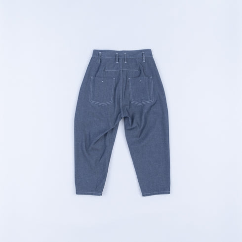 [Material] High twisted polyester & cotton / dry twill denim Polyester 60% Cotton 40% A 10 oz twill denim fabric made with a strong twisted yarn-dyed polyester thread of number 9 single yarn for the warp and a number 9 single yarn unbleached cotton thread for the weft. It is not indigo dyed, so it is a denim fabric that is easy to handle and does not easily transfer or fade. Since it is made of polyester, it would be ideal to finish it in the Hokuriku region, where polyester is popular, to stabilize the physical properties, but to bring out the denim-like texture, it is finished at a factory that specializes in denim. As a result, the shrinkage rate in the vertical direction is likely to vary, so when washing, please wash with water and dry in the sun. *Do not tumble dry.