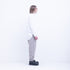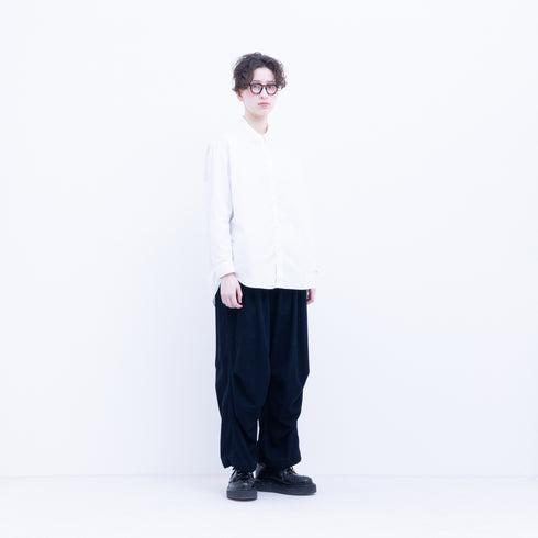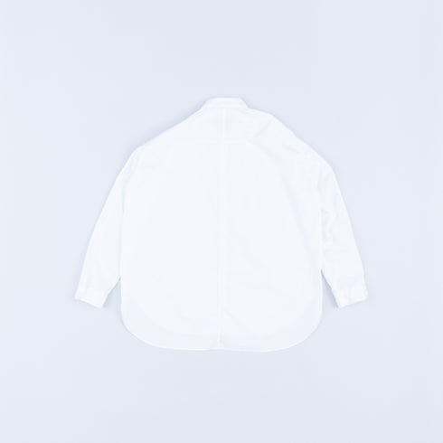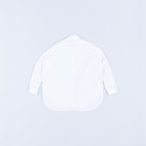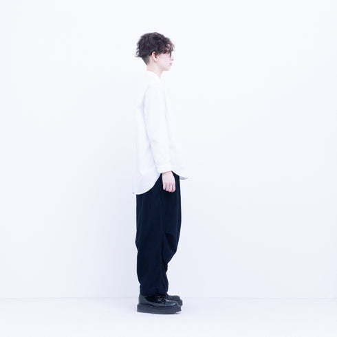 Shirt collar with stand collar Slightly dropped shoulders Wide body Two-piece sleeves Gusset at sides and hem Round hem Longer at back