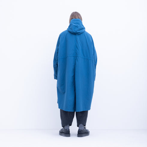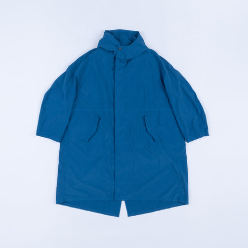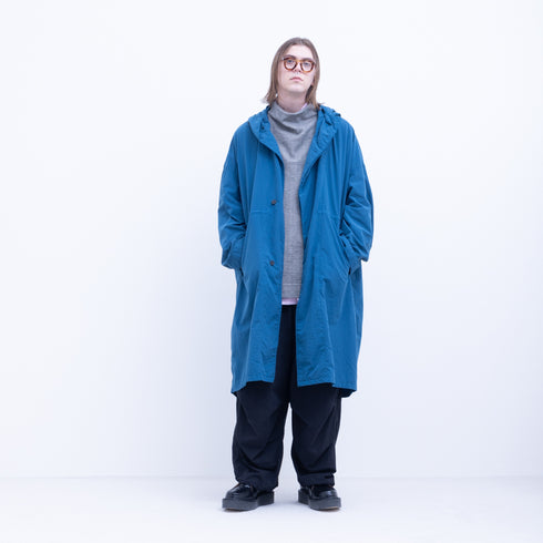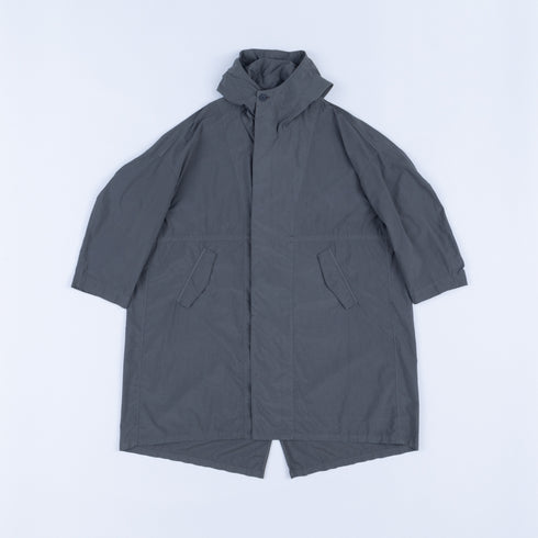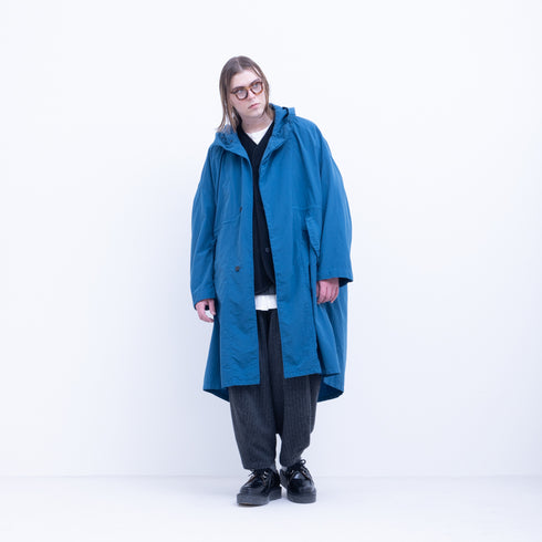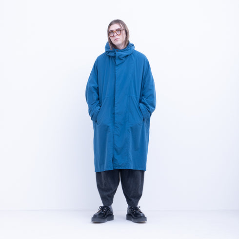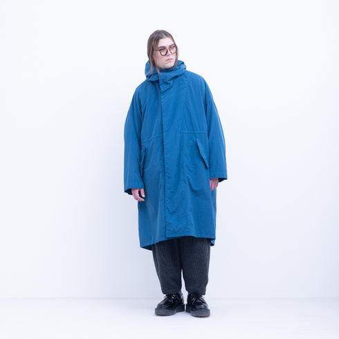Mod coat, oversized, center front zipper, hood, drawstring and stopper on inside waist, fishtail, single welt pocket and flap