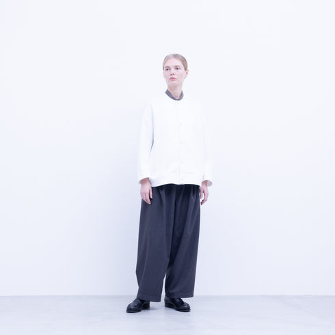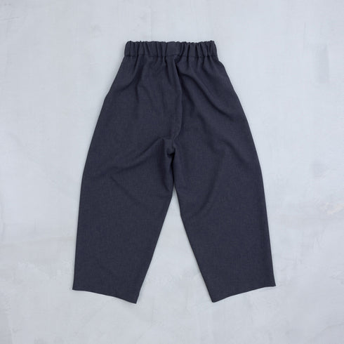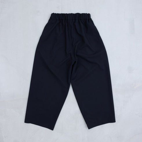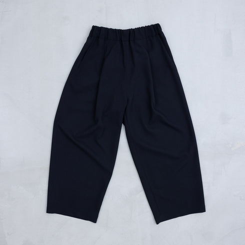 One tuck at the front waist No side seams No side seams emphasize the tube-like feel Front and back pockets at the sides Elastic waistband and drawstring