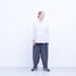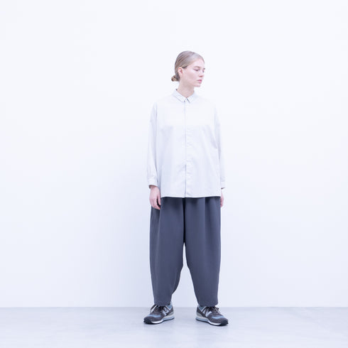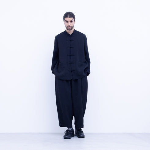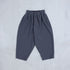 9/10 length Crotch fold Gathered waist Wide tapered Side seam pockets Elastic waistband and drawstring