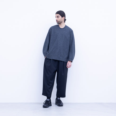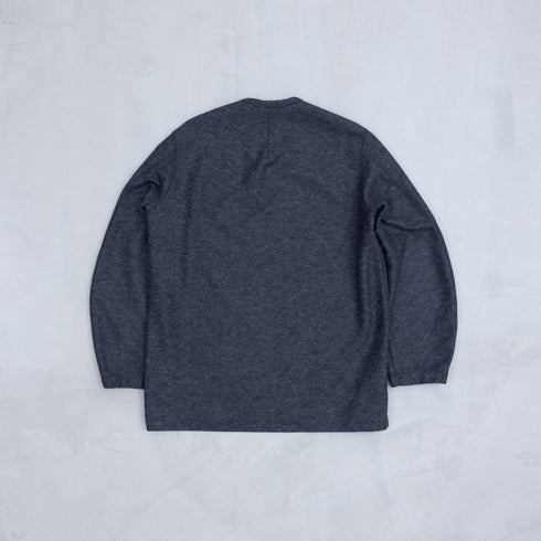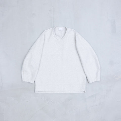 Crew neck, just the right size, strong curves below the elbow, double sleeves, slits at the sides, long back hem