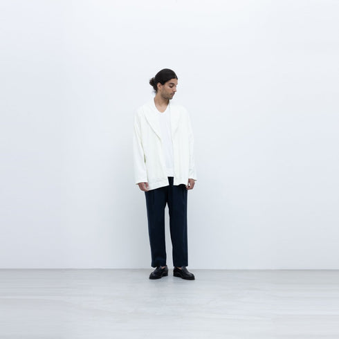 This is a plain weave fabric similar to worsted twill, made by combining tightly twisted polyester yarn and a blend of polyester and linen yarn.