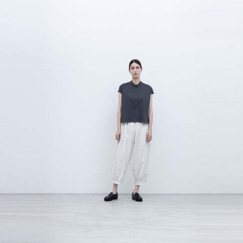 This is a plain weave fabric similar to worsted twill, made by combining tightly twisted polyester yarn and a blend of polyester and linen yarn.