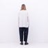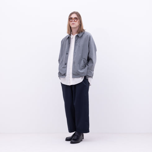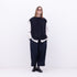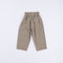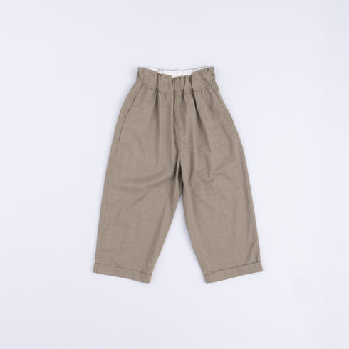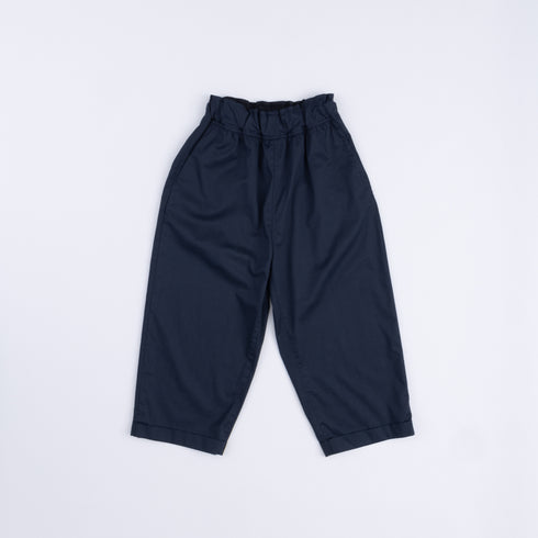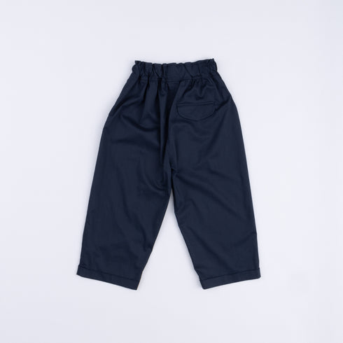 Straight gathered pants, double gathered waist at hem, slant pockets on the sides, flap pocket on the right hip, elastic waistband and drawstring