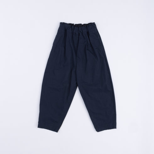Pants with rounded sides and strong tapered hems. Side seam pockets. Right hip flap pocket. One front tuck. Elastic waistband and drawstring. Full length.