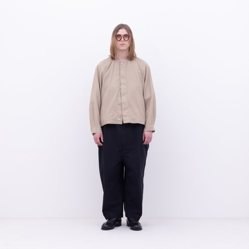 Collarless jacket, raglan sleeves, front placket, hidden placket, side seam pockets
