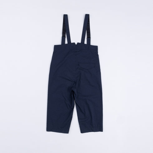 Chimney pants with removable suspenders, adjustable length with buckles, center front zip pocket, side seam pockets, flap pocket on the right back, full length (longer).