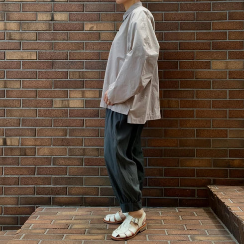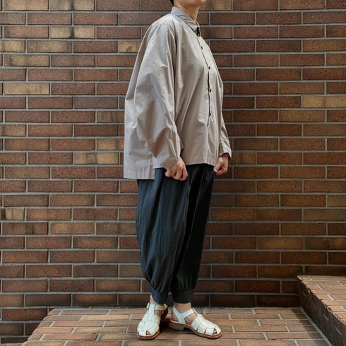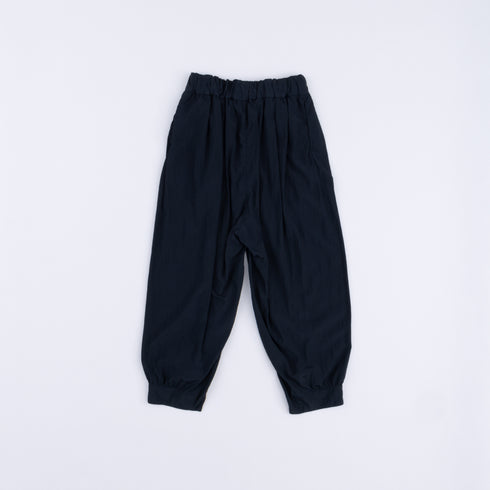 Gathered pants with ribbed hem. Front and back pockets with darts on the sides.