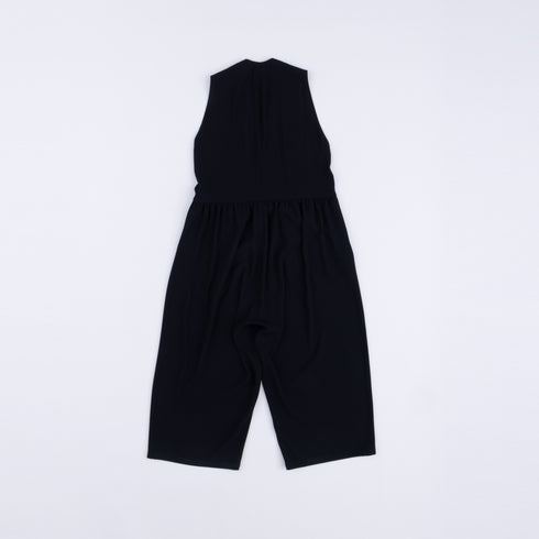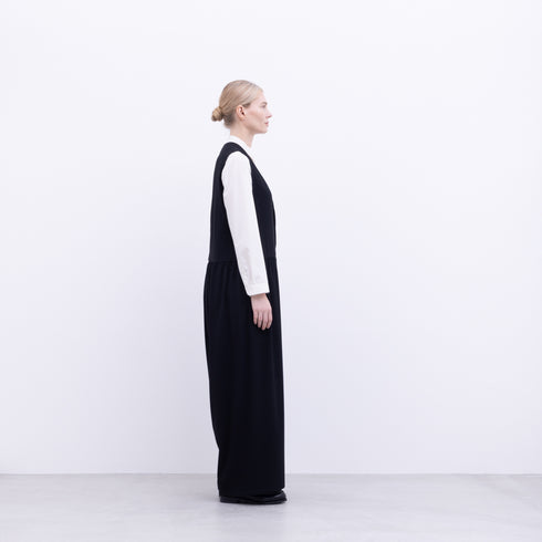 Full length overalls, waist gathers, armholes with side tucks, front button closure, wide silhouette pants, front and back seam pockets, no side seams, no lining