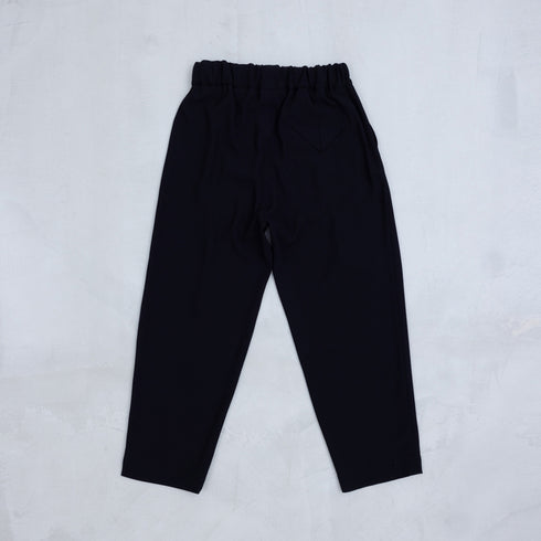 Straight pants, full length, one front tuck, side seam pockets, elastic waistband and drawstring
