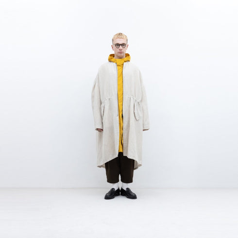 The fabric is made of tassar weave, which uses slightly thicker weft threads, so it has a slight horizontal ridge and is brushed, giving it a soft feel despite being made of nylon. It is a fluffy fabric that is light and voluminous.