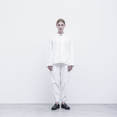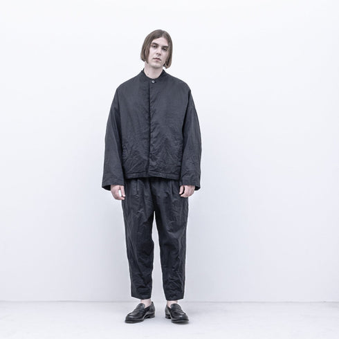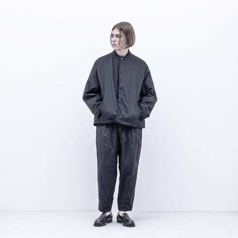 Bottle neck blouson, slightly raised collar along the neck, front placket, hidden placket, single welt pocket, slits at cuffs and back hem