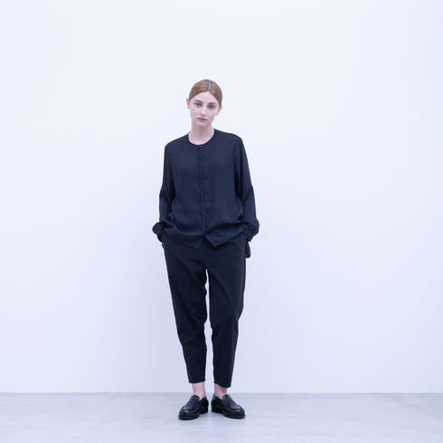 強撚した上に皺加工を施しているため表面に強く皺が見られるのが特徴で肌離れも良く、ほどほどの厚みとストレッチ性がありますので、年間通して着られる素材です。洗っても縮みにくい素材です。生地の最終加工に撥水加工が施されているため少し撥水機能があります。