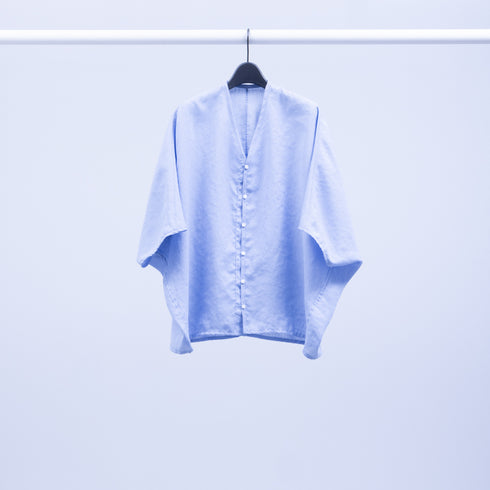 細番手のスラブトリアセテートを使用した甘平織のガーゼ生地です。トリアセテート糸の表面にマイクロファイバーコーティングを施し麻のような質感を出しています。とてもシワになりにくく、薄く軽い生地感です。洗いによる形態の変化も少なく扱いやすいストレスのない素材です。吸水速乾、接触冷感の機能があります。00.Whiteは透け感がありますが、濃色はそれほど透け感はありません。