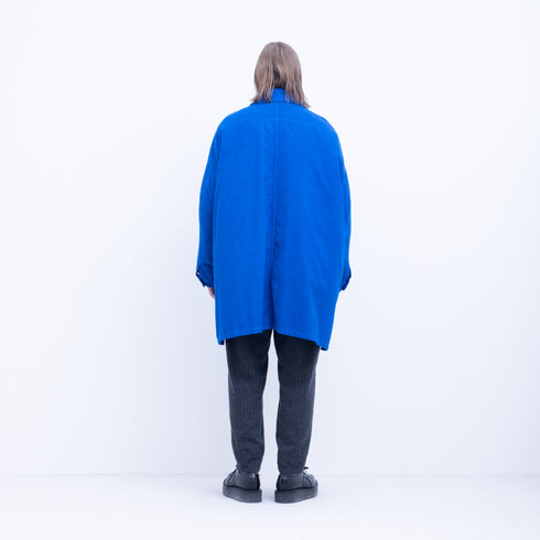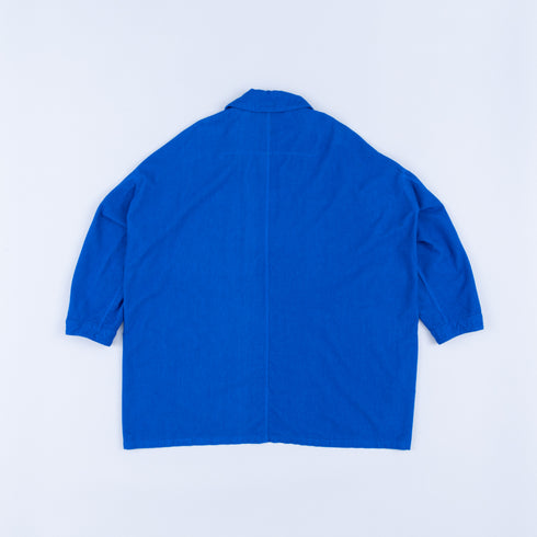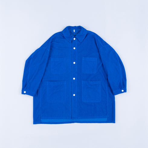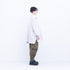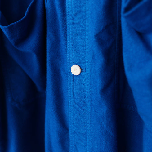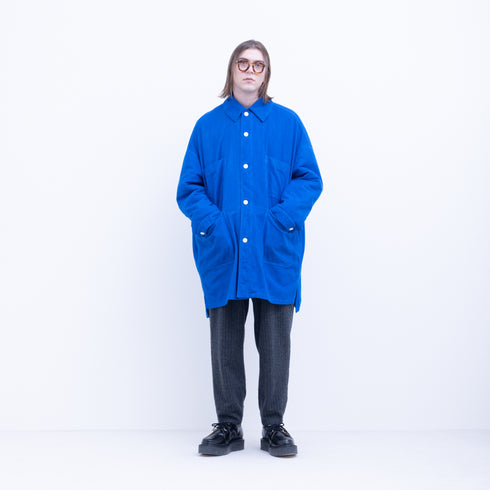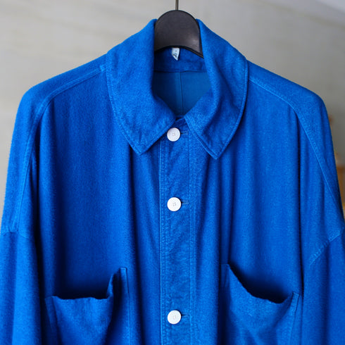 経糸に綿、緯糸にレーヨン双糸を使った平織り生地を深く起毛しています。レーヨンは非常に暖かいのが特徴でこの生地もとても暖かく、加えて起毛することで滑らかに柔らかくなった風合いが特徴です。レーヨンの量が多い生地ですので製品染めを施すことで生地のコシがなくなり、独特の重みと落ち感をもった心地よい生地に仕上がっています。製品染めは釜が小さいためロットによって色差が出ます。セットアップにする際色味が若干異なる場合があります。ご了承ください。起毛が濃く染まり奥のベース生地が薄く染まります。染めムラのように感じる場合がありますが、これはこの生地の特徴です。また、サイズ感も個体差が出ますのでご了承ください。