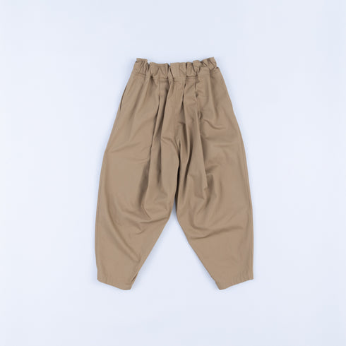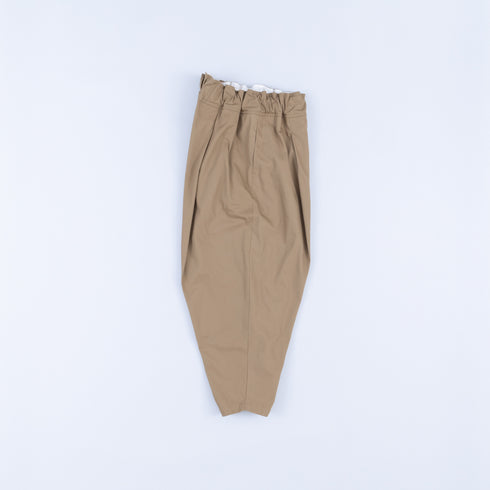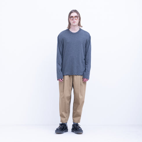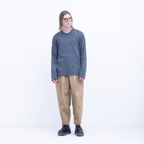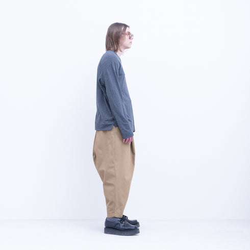 極限まで撚りを強めたコットンポリエステルの糸で織った高密度のギャバです。糸を極端に強撚することで皺になりにくくなり、速乾性や落ち感が加わって、地味な生地ではありますが綿のギャバとしては理想的な生地であると思います。TCですので頑丈で長く着用できる素材です。