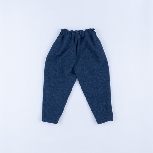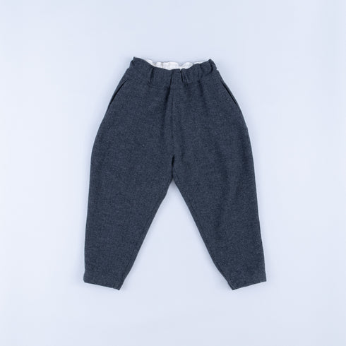 八番単糸の英国羊毛のツィード糸でヘリンボン柄に織った生地です。元々太い糸を使用した肉感のある生地ですが、製品洗いとタンブラー乾燥をすることでさらに大きく膨らみを出して厚みを追加しています。