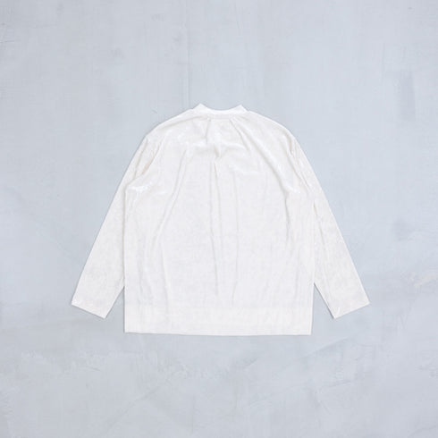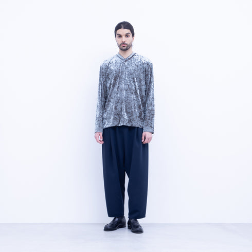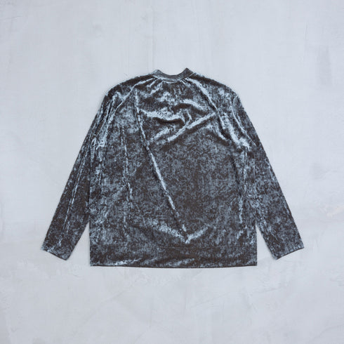 シャンブレーに染め分けクラッシュ加工を入れたニットベロア生地です。