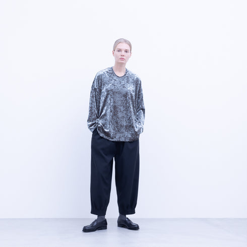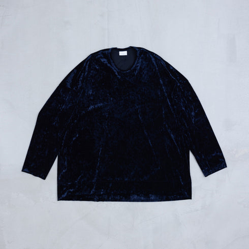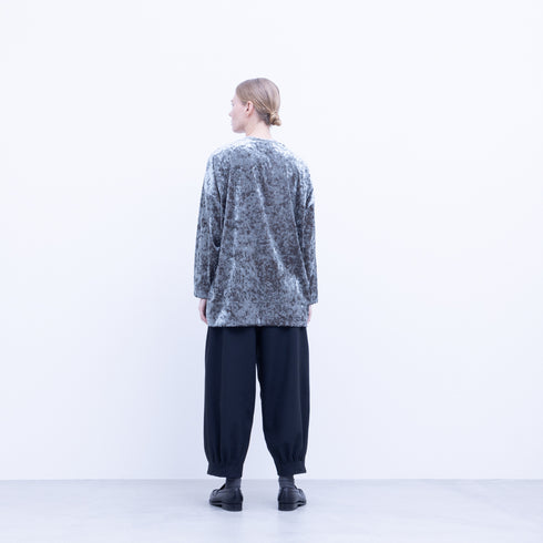 シャンブレーに染め分けクラッシュ加工を入れたニットベロア生地です。