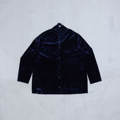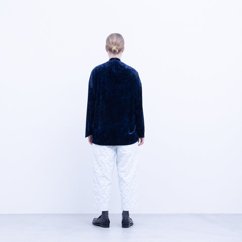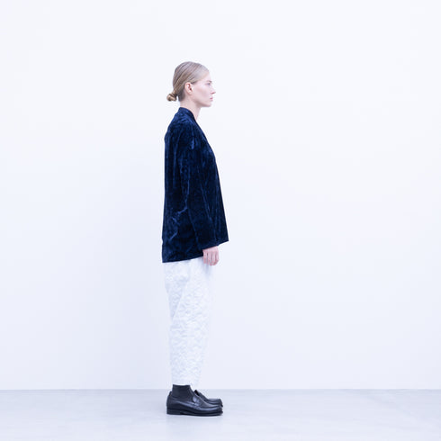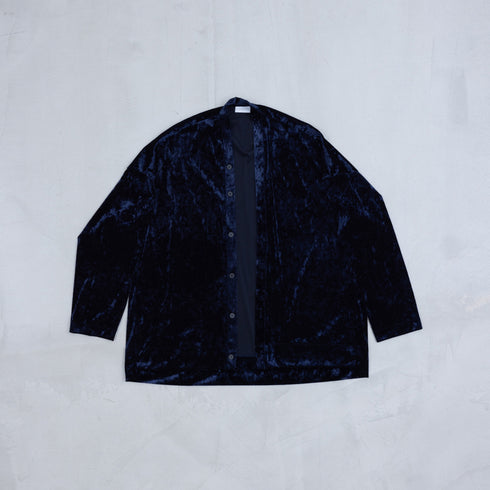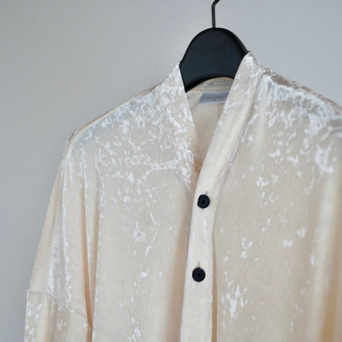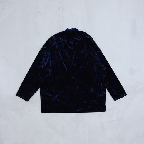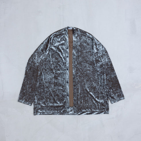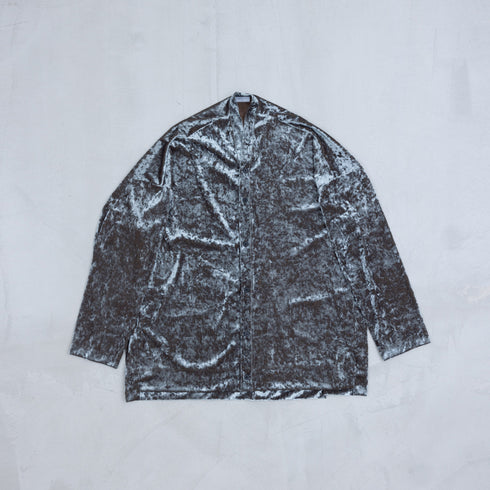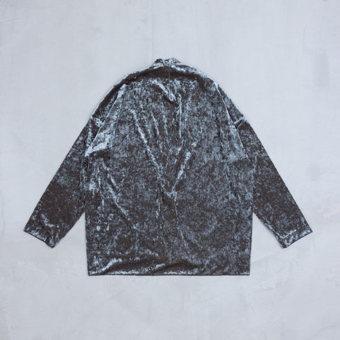 シャンブレーに染め分けクラッシュ加工を入れたニットベロア生地です。