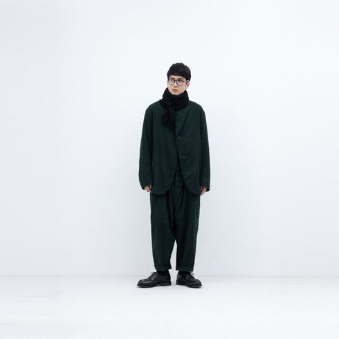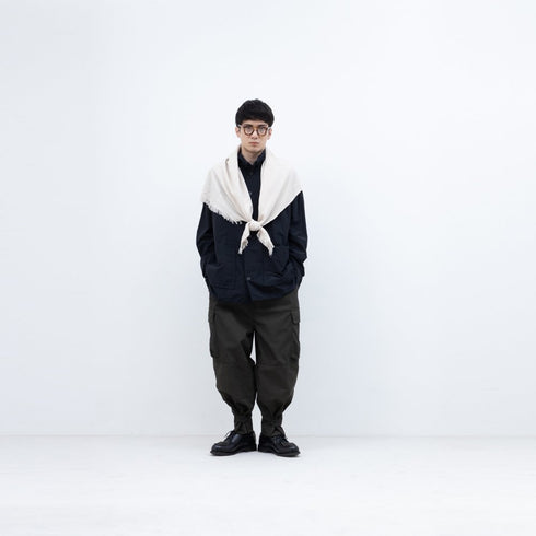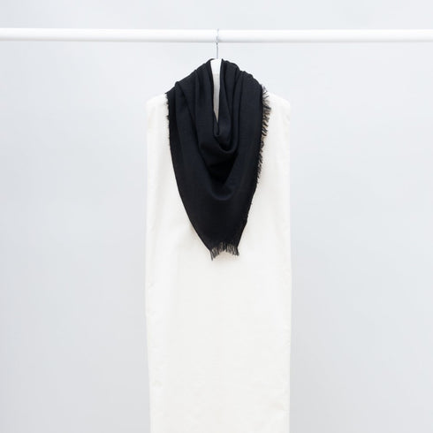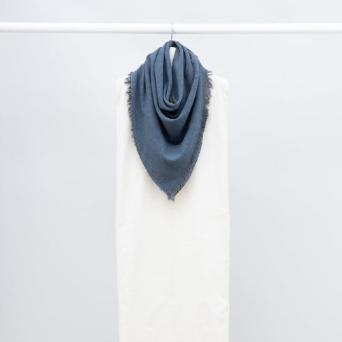 追撚したレーヨンとリネンの平織りボイル生地です。レーヨンの落ち感と、麻のしなやかさ、ボイルの清涼感をミックスした生地で通年通して使用できるストールです。製品染めを施すことでボコボコとした凹凸が生まれ豊かな表情を持っています。製品で染めているため、糸の中心が白く見える部分などが見受けられますが製品染めである以上これは避けられませんのでご了承ください。また、フサの部分はハンドでの成型となるため不均一になりますのでこちらもご了承ください。個体差や色むらが見られます。不均一な風合いをお楽しみください。