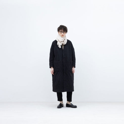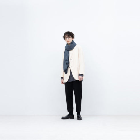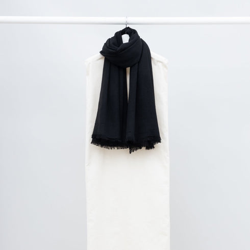追撚したレーヨンとリネンの平織りボイル生地です。レーヨンの落ち感と、麻のしなやかさ、ボイルの清涼感をミックスした生地で通年通して使用できるストールです。製品染めを施すことでボコボコとした凹凸が生まれ豊かな表情を持っています。製品で染めているため、糸の中心が白く見える部分などが見受けられますが製品染めである以上これは避けられませんのでご了承ください。また、フサの部分はハンドでの成型となるため不均一になりますのでこちらもご了承ください。個体差や色むらが見られます。不均一な風合いをお楽しみください。