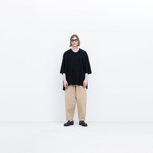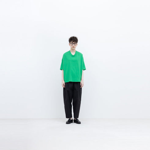 超高密度に織られた綿のタイプライター生地です。生地で揉むように洗い込み マットで毛羽立った質感を出しています。さらに製品で洗いタンブラー乾燥させることで膨らみのある軽やかな生地感に仕上げています。洗いを強く入れることでランダムにシワが入り、シワ感が一定しない場合があります。あえて粗野な糸を使っているためフシやムラ、結び目、飛び込み等が見られますがこれはこの生地の特徴ですのでご了承ください。