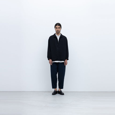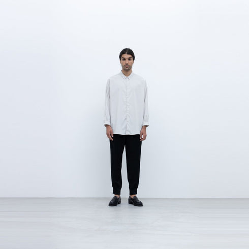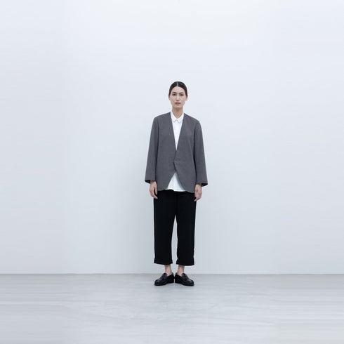綿でいうと60番単糸平織程度の厚みで薄く軽く爽やかな雰囲気の生地感です。SY加工を施しているため表面に細かな皺感がありナチュラルな風合いです。着用に関する皺は付きにくく扱いやすい生地です。フルダル糸は透けが少ないので淡色でも透けにくいのも特徴です。