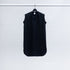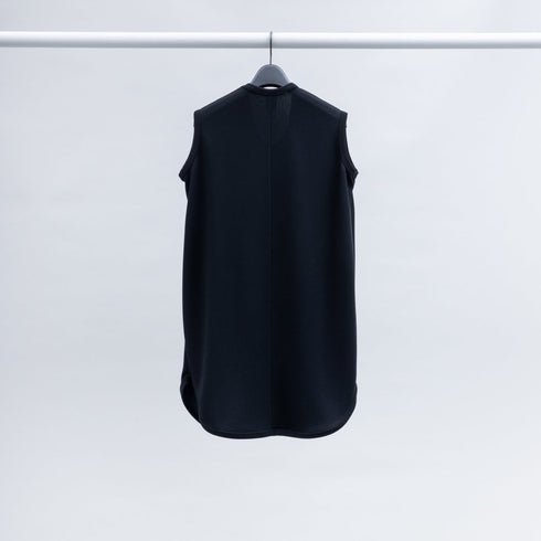 表面には芯に高収縮ポリエステルを配した芯鞘(しんさや)構造のポリエステル長繊維を使った強撚糸、裏面にポリウレタン糸を引き揃えたポリエステル糸を使用した二重編みで深い色味のニット生地です。表面はリブ編みに見えますが実際はピケ風の編みになっている珍しい編みです。リブやテレコと違い製品としての安定感もありとても扱いやすい生地になります。製品洗いを施しているため、カラーによってサイズが異なる場合があります。