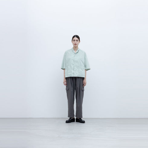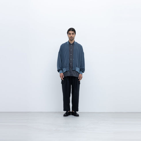 強撚した上に皺加工を施しているため表面に強く皺が見られるのが特徴で肌離れも良く、ほどほどの厚みとストレッチ性がありますので、年間通して着られる素材です。洗っても縮みにくい素材です。生地の最終加工に撥水加工が施されているため少し撥水機能があります。