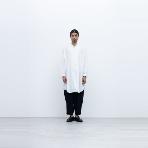 経糸緯糸共に30/-のスパンポリエステル糸を使用したローン生地です。ローンにしては太い糸を使用していますので透け感は無く柔らかいシャツ生地に仕上がっています。製品染めを施すことでパッカリングを出し粗野な感じを出しています。