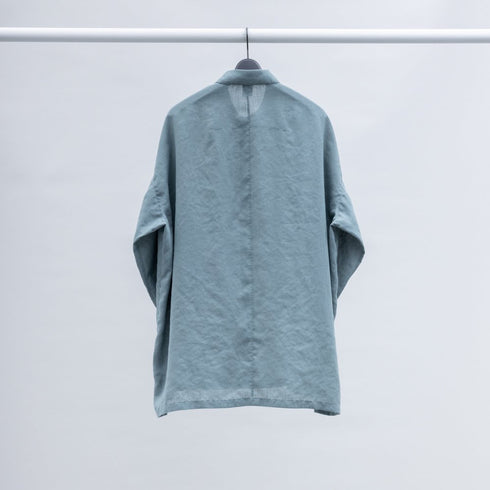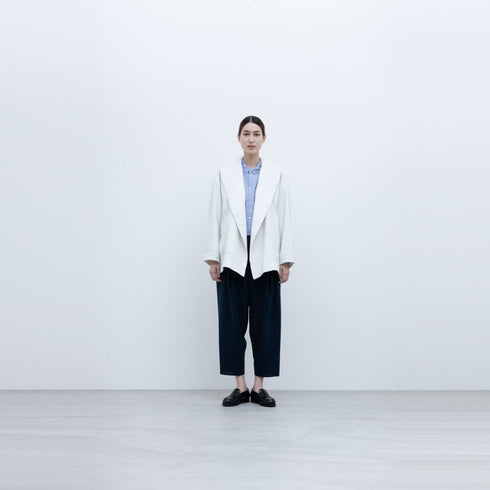 細番手のスラブトリアセテートを使用した甘平織のガーゼ生地です。トリアセテート糸の表面にマイクロファイバーコーティングを施し麻のような質感を出しています。とてもシワになりにくく、薄く軽い生地感です。洗いによる形態の変化も少なく扱いやすいストレスのない素材です。吸水速乾、接触冷感の機能があります。00.Whiteは透け感がありますが、濃色はそれほど透け感はありません。