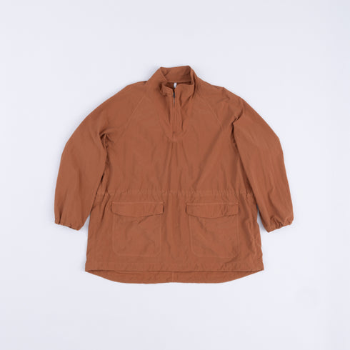 ふくらみが出て軽さのあるボリュームが出る生地です。この生地の特徴として、パネル毎に色の濃淡の差があります。また、大きくパッカリングが出て巻き縫いをはじめとする縫い目部分に色が入らずにやや薄くなっています。ナイロンは染料をたくさん吸うため色も深く複雑に染まり言葉で説明しにくい深い色となります。 製品染め タンブラー乾燥済み