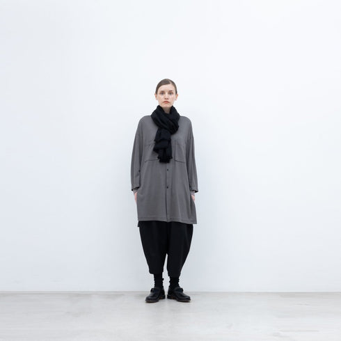 30/1のレーヨンで織ったツイル生地を製品染めを施して、マットでパウダリーなタッチを出した生地です。レーヨンは染料をたくさん吸うため発色が良く深い色に染まるのが特徴です。