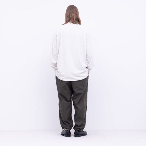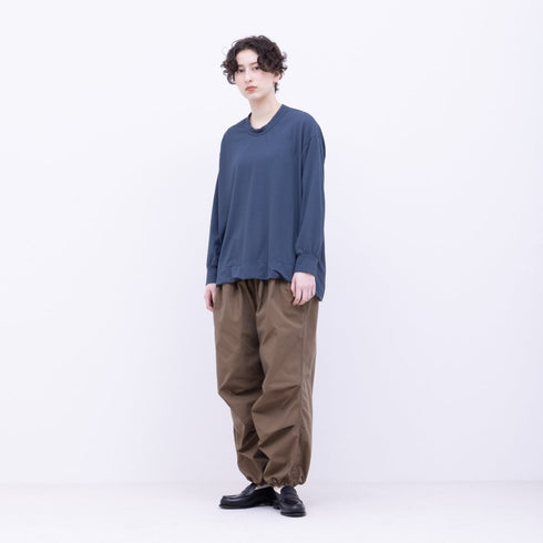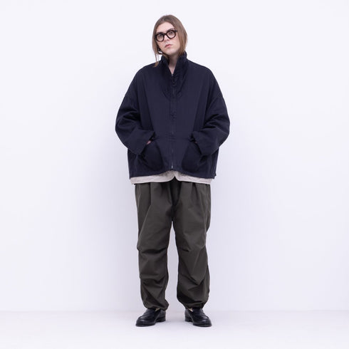 先染め糸の交織により奥行きのある表情となっています。しっかりとした厚みとコシがありつつ、ヌルみとしなやかさを持ち合わせていてナイロンとポリエステルの特徴を持ち合わせた独特な生地感です。非常に頑丈ですので長く着用できる生地です。