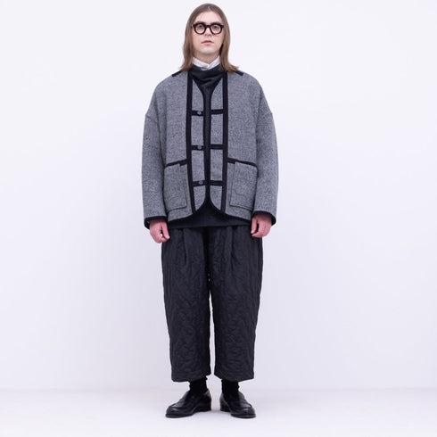 表面のツィードのヘリンボーンと裏面のヴァージンラムウールのコントラストを楽しんでいただければと思います。