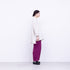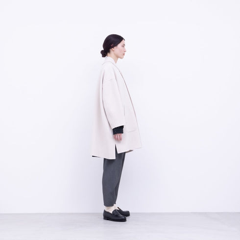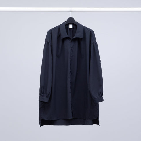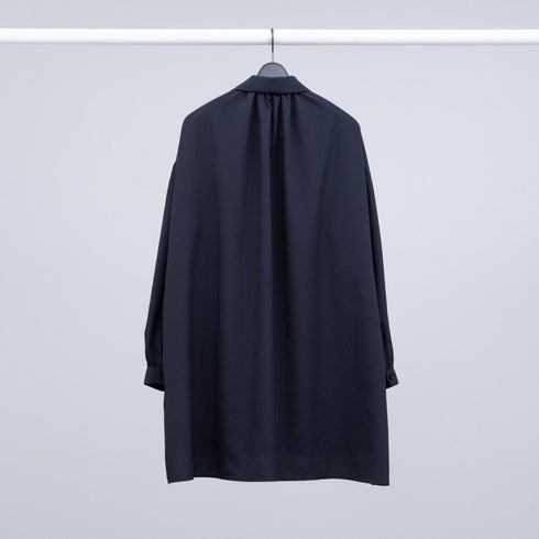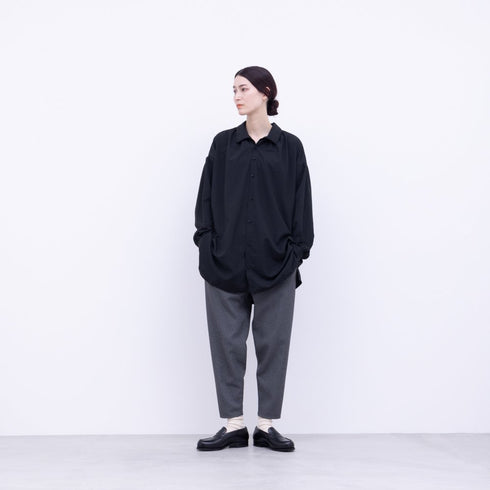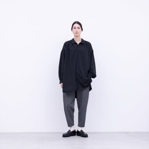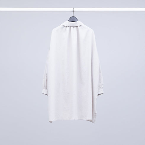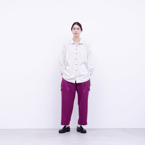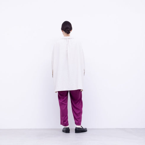 綿でいうと60番単糸平織程度の厚みで薄く軽く爽やかな雰囲気の生地感です。SY加工を施しているため表面に細かな皺感がありナチュラルな風合いです。着用に関する皺は付きにくく扱いやすい生地です。フルダル糸は透けが少ないので淡色でも透けにくいのも特徴です。