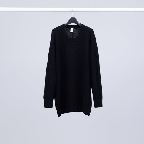 カシミヤ100%の26/2の糸を7ゲージの編機でワッフル組織で空気を多く含むように甘く編んだ横編みニットです。