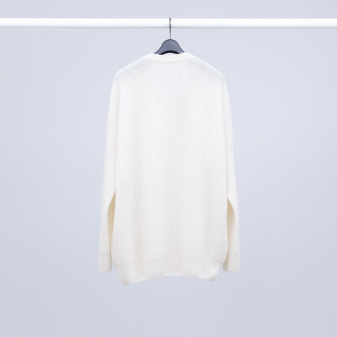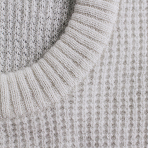 ホワイトカシミヤはカシミヤの中でも繊維長が長く細い素材です。ワッフルの立体的な編み組織であたたかく、非常に軽い着心地です。