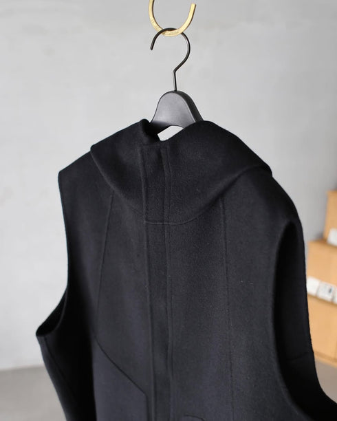 18.5μの羊の脇腹の毛に子羊の毛をブレンドした特殊なウール糸を使用した両面ビーバー仕上げの接結二重織生地です。毛並みを揃えるためにご着用後は表面をブラッシングしてください。アイロンによる高温の蒸気で色ムラが発生する場合があるためスチーマーの使用はお控えください。