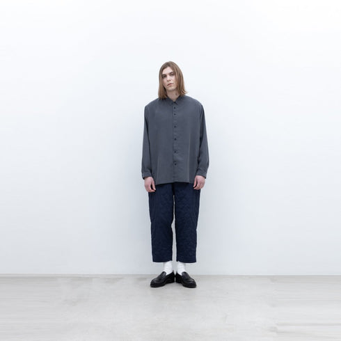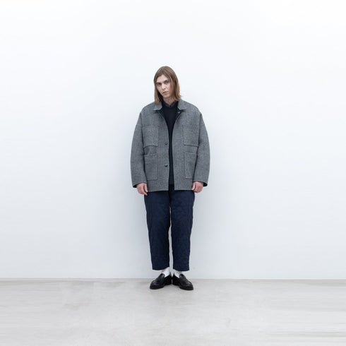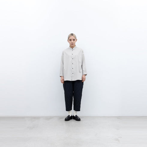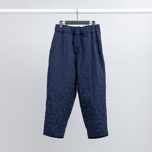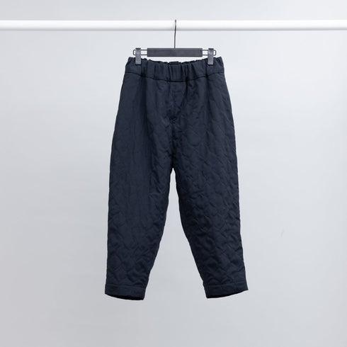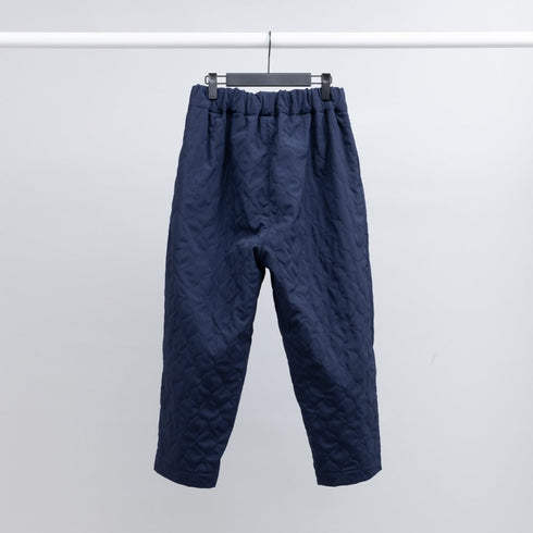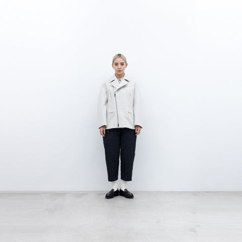 表地に、#01ページのフルダル(光沢のない)ポリエステルのタスラン加工糸を使用した平織り高密タイプライター生地、中に高機能中生地KOMATHERMO(コマサーモ)、裏地にポリエステル裏地を貼り合わせて細かいステッチでキルティングした生地です。