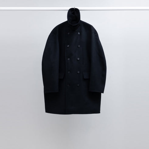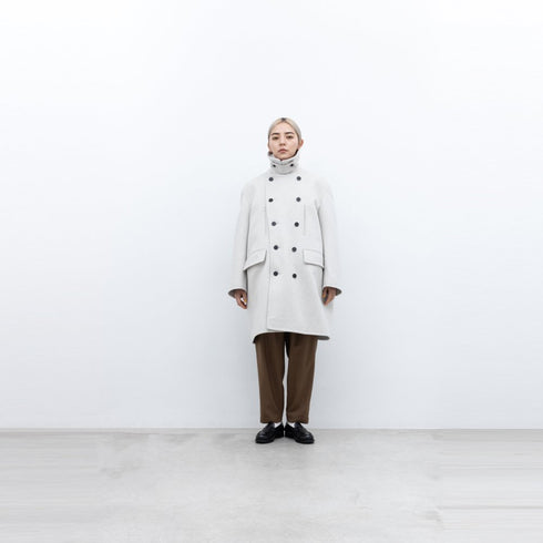 1/10 super100's原料を使用したウール100%のショートビーバー生地です。少し毛足の長いメルトン生地だと思っていただければイメージしやすいかと思います。ゆっくりと縮絨をして毛羽を短めに整え、押さえをしっかりとかけて目面の詰まった表情と綺麗な光沢をつくりだしています。見た目よりも軽い着心地の生地て?す。