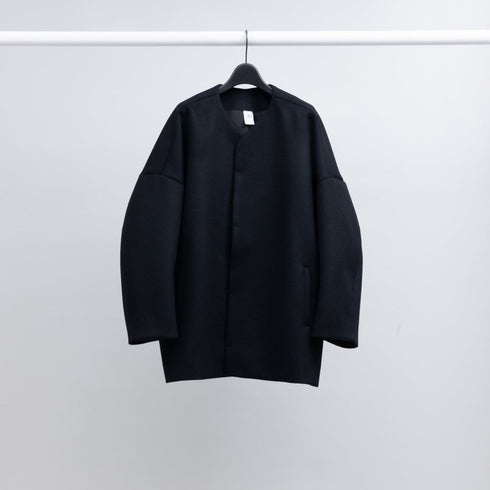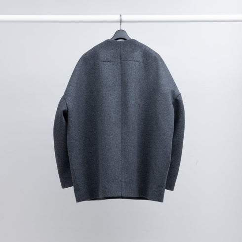 1/10 super100's原料を使用したウール100%のショートビーバー生地です。少し毛足の長いメルトン生地だと思っていただければイメージしやすいかと思います。ゆっくりと縮絨をして毛羽を短めに整え、押さえをしっかりとかけて目面の詰まった表情と綺麗な光沢をつくりだしています。見た目よりも軽い着心地の生地て?す。