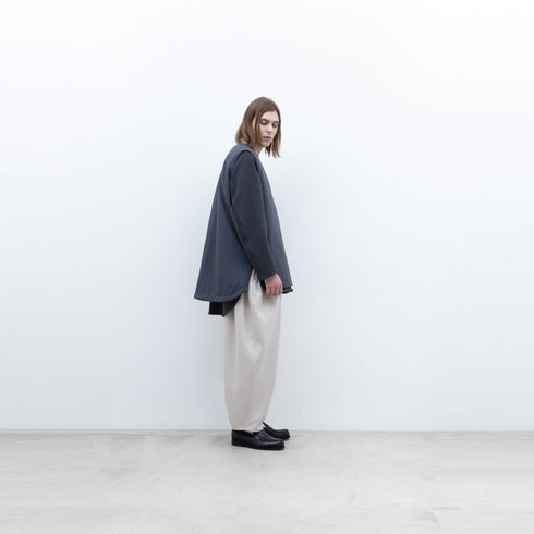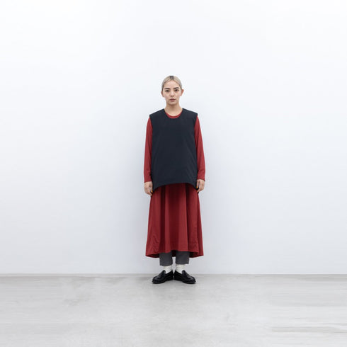 75dのポリエステル糸で織った高密度のタフタです。微起毛と皺加工を入れているため柔らかくぬめりのある風合いに仕上がっています。とても軽くシワになりにくい素材です。年間通しての素材です。今季は全ての型に三菱ケミカルのコアブリッド中綿をキルティングした裏地を使用しています。中綿が入っていてもとても軽量で着やすい素材です。